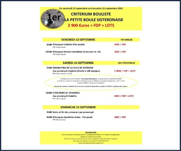La Petite Boule Sisteronaise organise son 1er Critérium Bouliste avec concours à Pétanque et au Jeu Provençal.