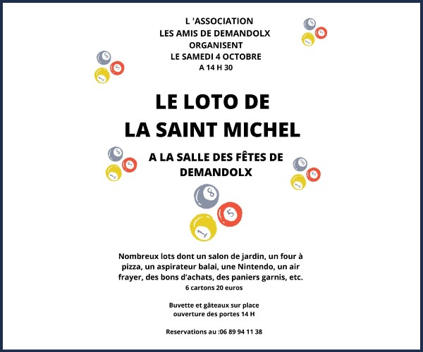 L'association "Les Amis de Demandolx" organisent le loto de la Saint Michel le samedi 4 octobre à 14h30.