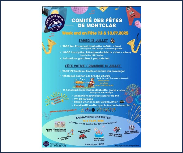 Fête votive les 12 et 13 juillet, organisé par le Comité des Fêtes.