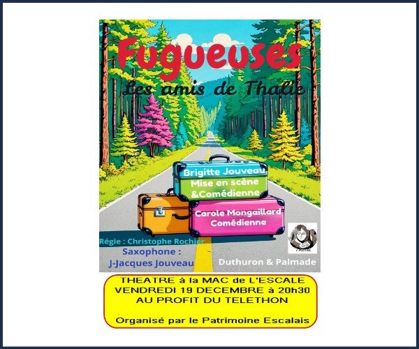 L’Escale A la MAC L'Escale, Alpes de Haute Provence, FranceÀ la M.A.C. à 20h30 dans le cadre du Téléthon – « Les Fugueuses », pièce de Pierre Palmade pour Line Renaud et Muriel Robin. Organisé par l’association du Patrimoine […]