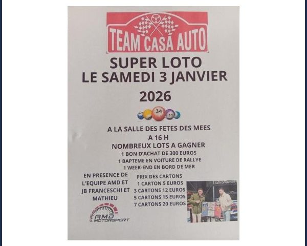 Voir plus09/12/2025 L'association Team Casa Auto organise un super loto à la salle des fêtes des Mées.