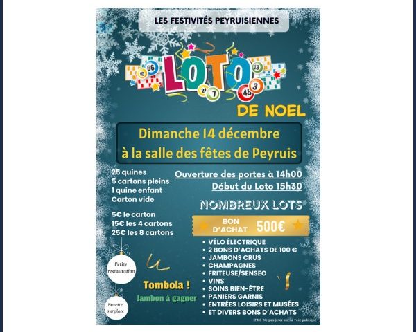 Voir plus09/12/2025 Loto des Festivités Peyruisiennes. 5 cartons pleins, 500 €, vélo électrique, nombreux bon d'achat de 100€, paniers garnie, billets musées, nombreux bon d'achat, jambon.