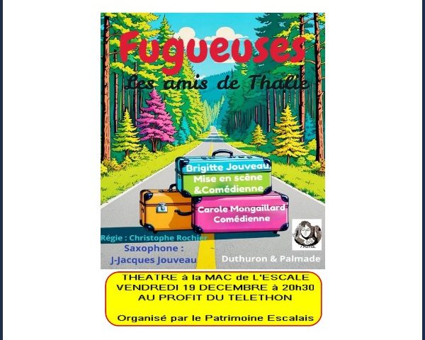 Voir plus12/12/2025 À la M.A.C. à 20h30 dans le cadre du Téléthon – « Les Fugueuses », pièce de Pierre Palmade pour Line Renaud et Muriel Robin. Organisé par l'association du Patrimoine Escalais. Au bord d'une nationale, une nuit, Margot fait du stop. Au bord d'une nationale, une nuit, Claude fait aussi…