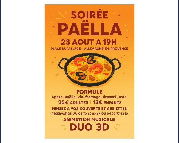 Voir plus09/07/2024 🎉 *Paella Party à Allemagne en Provence !* 🎉