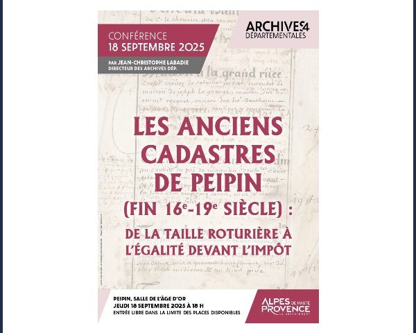 Voir plus03/09/2025 Conférence par Jean-Christophe Labadie, directeur des Archives départementales : Les anciens cadastres de Peipin (fin 16e- 19 e siècle) : de la taill roturière à l'égalité devant l'impôt.