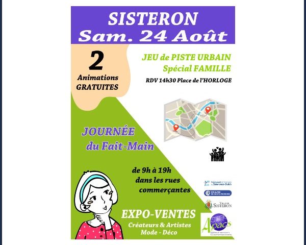 Voir plus14/08/2024 Lors de la Journée du Fait Main dans les rues de Sisteron, l'Association des Commerçants vous propose un jeu de piste urbain en famille !
