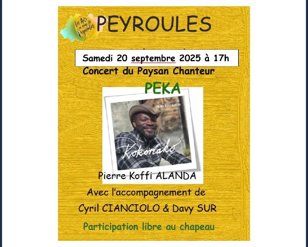 Voir plus07/09/2025 Le concert de Peka, le paysan chanteur, le samedi 20 septembre à 17h00.