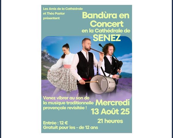 Voir plus28/07/2025 L'association des Amis de la Cathédrale de Senez organise le 13 août prochain un concert dans la cathédrale de Senez avec le groupe musical " Bandùra ".